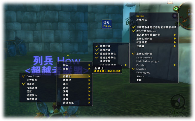 Detox一键净化团队不良状态,实时监控团队的不良状况,并能设置姓名,DEBUFF过滤等。点击小地图上的图标进行设置。3月5日更新为最新版,使用了最新的库文件,并为WOW 2.4版本添加了内容。
