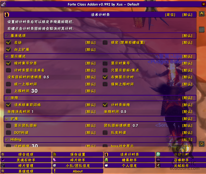 Forte Warlock 术士模块. 改模块包括要计时的buff和debuff,碎片管理,提示信息等功能. 它需要和casting,冷却条,计时条等模块一起工作